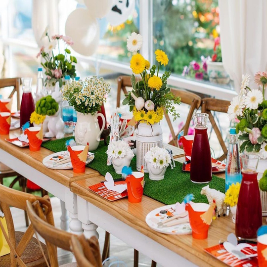 Eşya seçiminde biraz eklektizm ile eko tarzda karmaşık olmayan dekor. Kendi evi olanlar veya kırsalda doğum günü kutlayanlar için harika bir fikir.